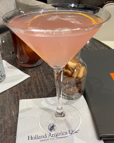 This was Holland-America’s “Orange Party” day, a day to honor the cruise line’s Dutch heritage, and King’s Day in Holland. For dinner I wore an orange shirt. Someone from our group ordered this cocktail, I think it was named an Orange Mule.