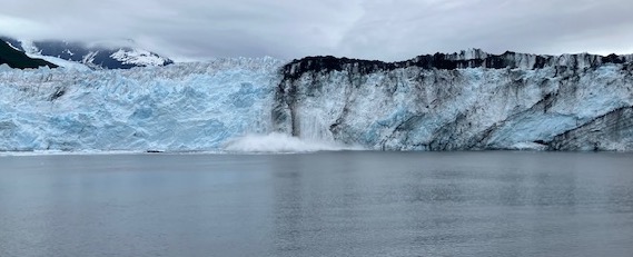 With the calving, when the large pieces of the glacier hit the water, waves immediately start to roll across College Fjord.