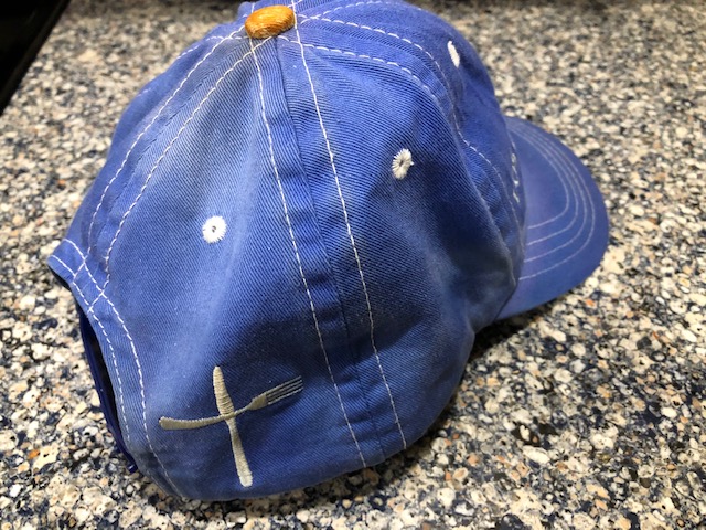 That hat could tell stories too. But, there is something special about the back of the hat. It has a cross embroidered on it. The cross is formed with a fork and a knife.