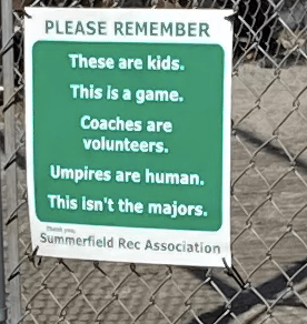 As the Commander Supreme was strolling around the grounds waiting for the game to start, she came upon a sign posted by the Summerfield Recreation Association. The sign’s gentle reminders are very appropriate.