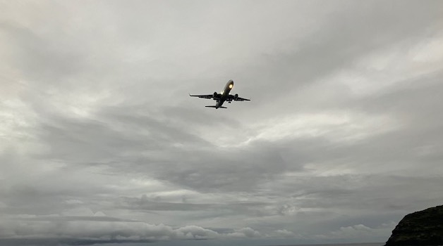 Then my eyes started to focus against the backdrop of the clouds, and a dark object moving toward the ship. Before I knew it, a huge jet was lumbering in over the ship on its final approach into the local airport.