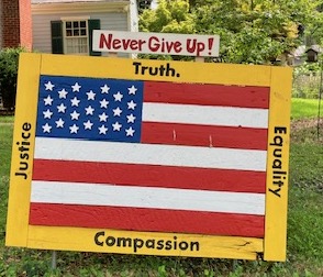 On top of a golden background was the American flag. At the top of the sign were the words—Never Give Up!