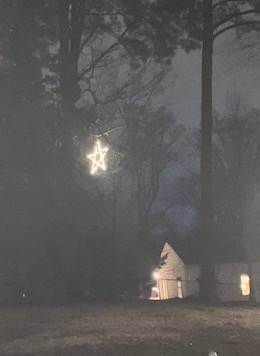 Two streets over from our home, I’m drawn to a singular light of a pretty star dangling beneath the limbs of pine trees in a backyard.