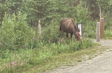 Just as our shuttle was leaving to take us back to the hotel, our alert driver spotted a moose casually munching on some weeds around one of the parking lots.