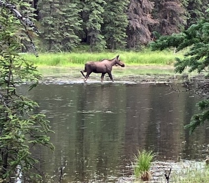 Then Betsy, Dan, and I took the free shuttle to the Horseshoe Lake Trail. It was here that we were rewarded—we saw a moose, a female moose, grazing in the shallows of the lake.