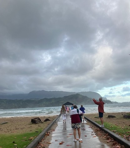 Our first stop for the day was the famous Hanalei Pier. The pier is part of a public beach on Hanalei Bay. The pier was made famous in the 1957 movie South Pacific. Even on a rainy morning, the beach, the pier, the narrow neighborhood streets, and the pretty houses made things brighter.